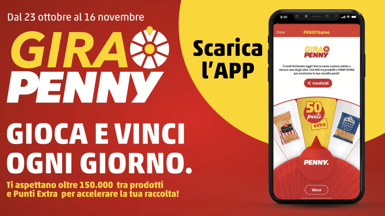 Dal 23 ottobre al 16 novembre 2025 torna “Gira Penny”, l’iniziativa gratuita che ti permette di vincere prodotti omaggio e punti extra ogni giorno semplicemente usando l’app Penny Market.