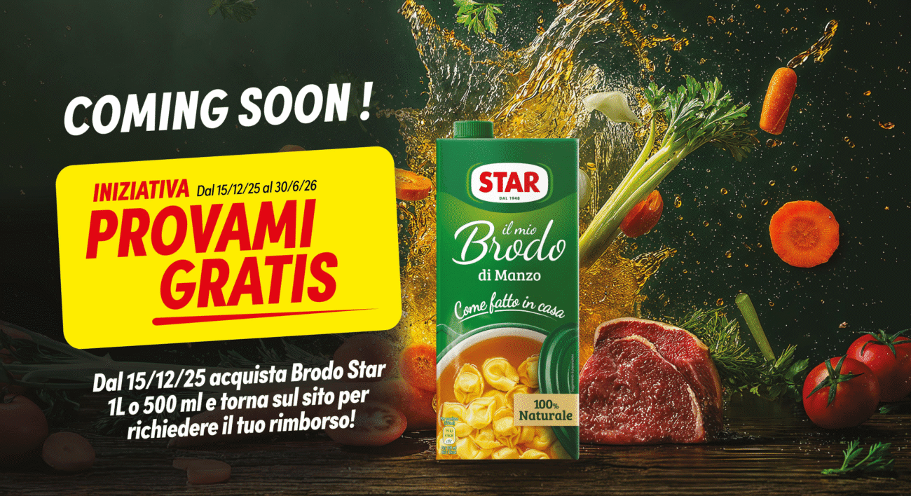- Prodotti Coinvolti: Acquista 1 prodotto Brodo Star a scelta tra le referenze da 1L o 500ml elencate nel regolamento (Manzo, Carne Mista, Pollo, Verdure, Manzo -30% sale, ecc.).